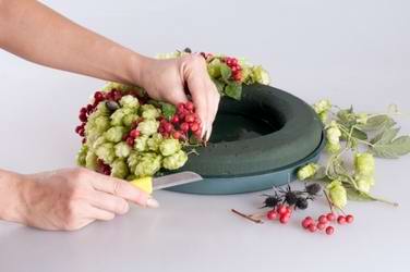 Для начала необходимо приобрести качественную флористическую губку — она станет оазисом, удерживающим влагу, и тем основанием, на котором всё будет держаться. Настоящие губки изготавливаются из прессованных водорослей, но также подойдёт и более бюджетный вариант – оазис из флористического пенопласта. В такой губке можно размещать растения под различными углами. Она легко режется ножом, что позволяет разместить её в емкости любой формы. Следует отрезать губку размером немного меньшим объема вазы. Флористические губки можно найти в цветочных магазинах. Губки зеленого цвета, которые хорошо поглощают воду, используются для аранжировок с живыми цветами, тогда как серые или коричневые – для композиций с искусственными материалами или сухими цветами.