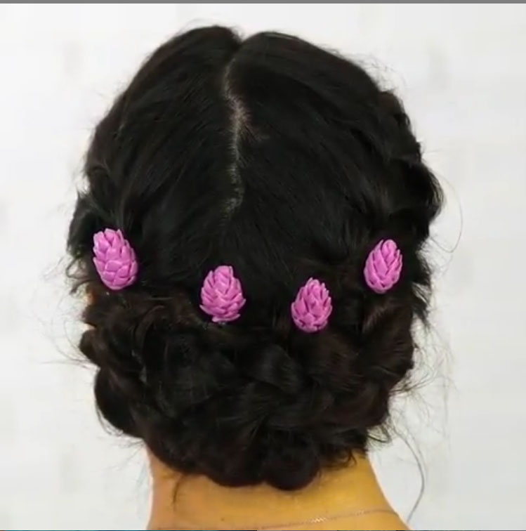 Теперь с помощью клеевого пистолета приклеиваем шпильки и вставляем их в прическу.