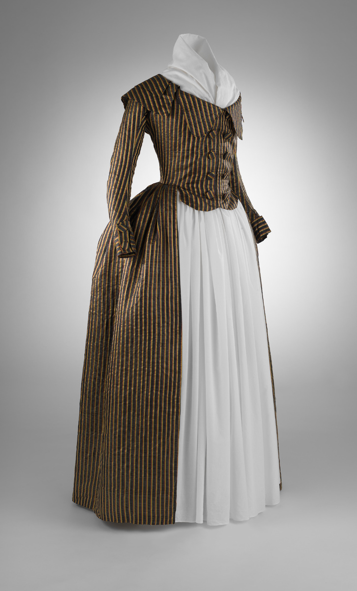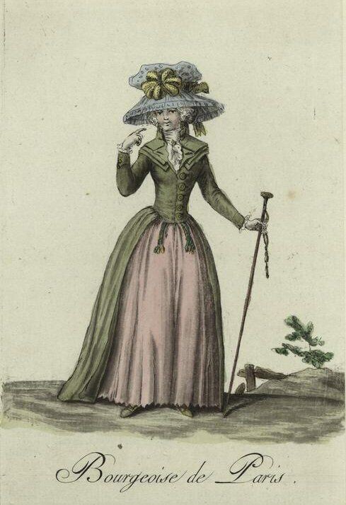 Французы также заимствовали у англичан образцы одежды, переделывая их по своему усмотрению, добавляя суровому английскому минимализму нотки изящества, беспечности и нарядности. После подписания Версальского договора (1778 г.) во Франции, переживающей трудные экономические времена, становится популярной сдержанность и простота, что делает английские ткани и простые силуэты особенно актуальными.