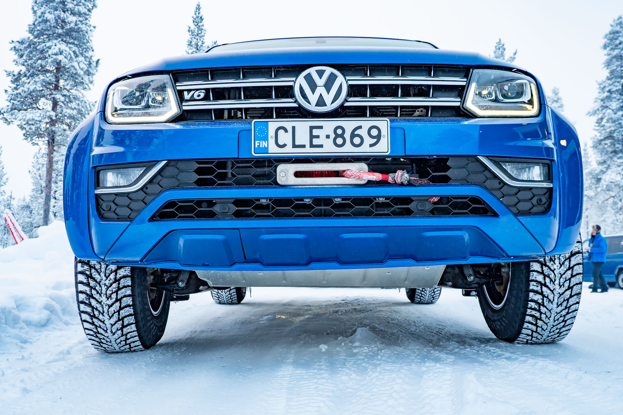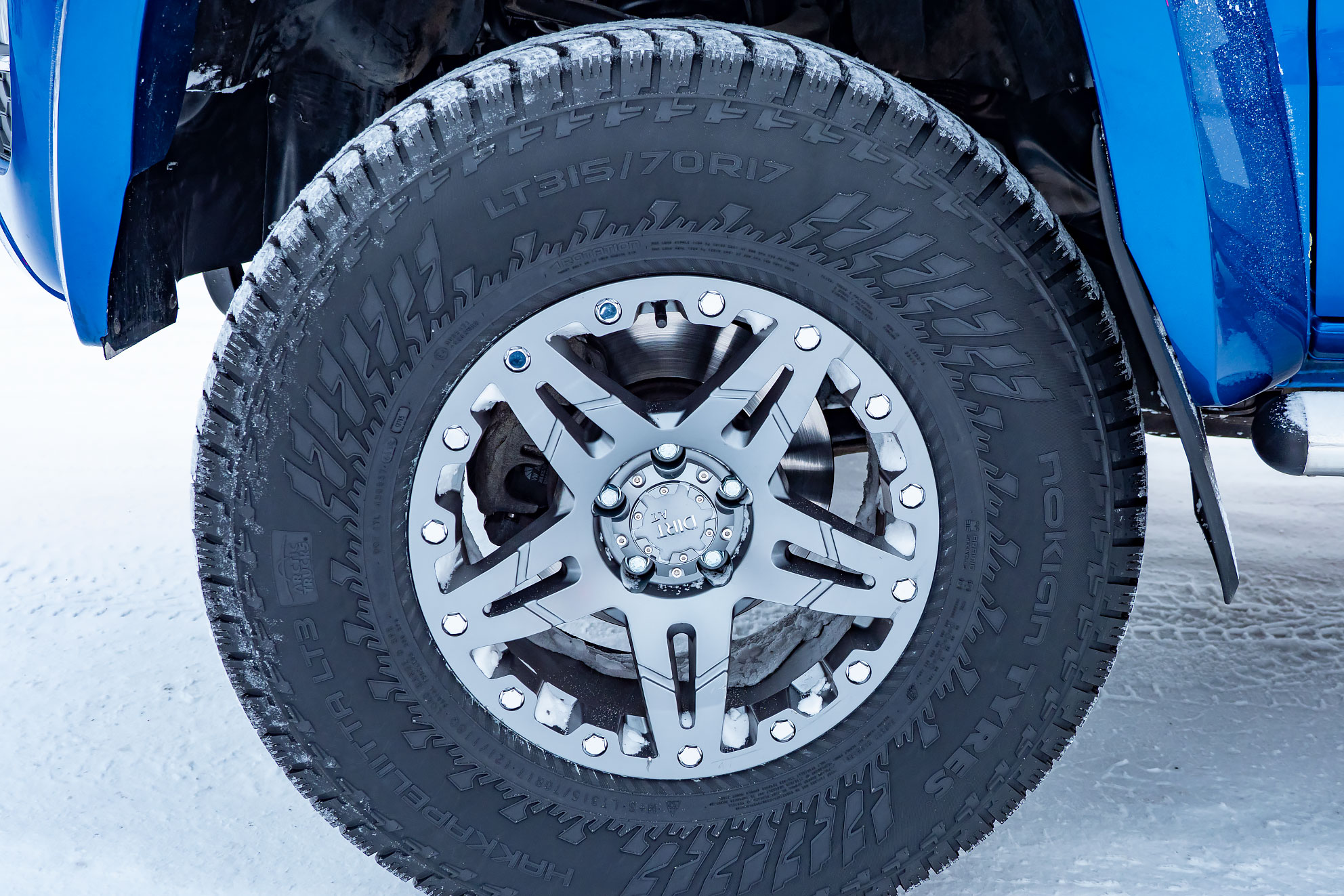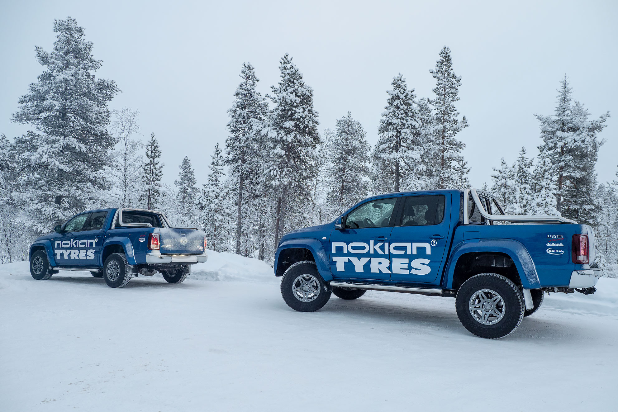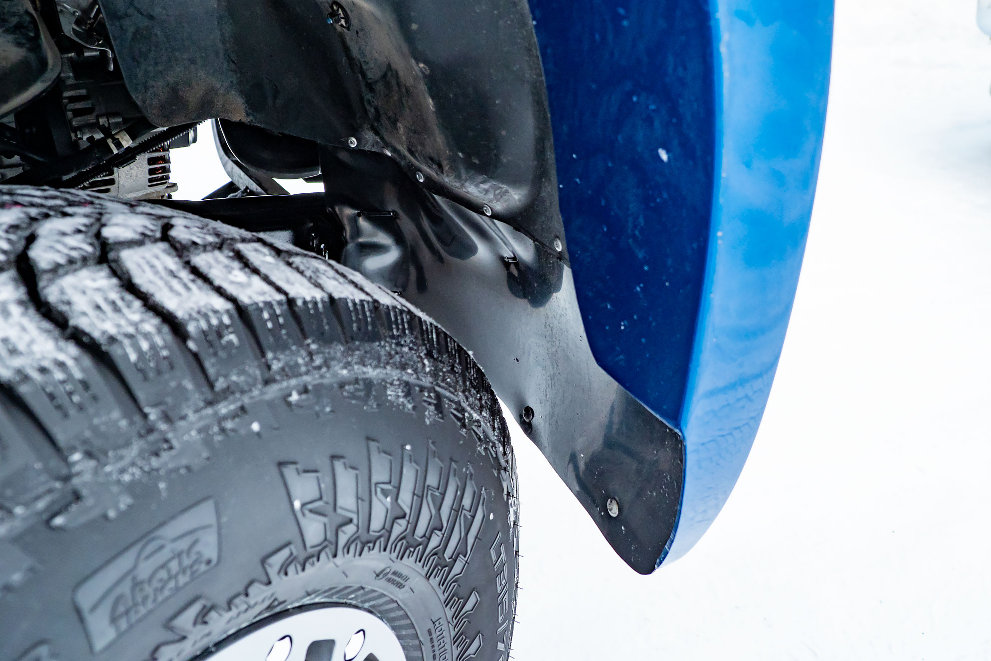 Отличить их можно по наличию лебедки под штатным бампером и ширине расширителей арок. Пикап без лебедки и с широкими расширителями стоит на 35-дюймовых шинах 315/70R17 (34,5 дюйма). Пикап с лебедкой под бампером и видимой алюминиевой защитой имеет 32-дюймовые колеса. Оба обуты в новые Nokian Hakkapeliitta LT3, ради которых мы приехали в Финляндию, на полигон White Hell.