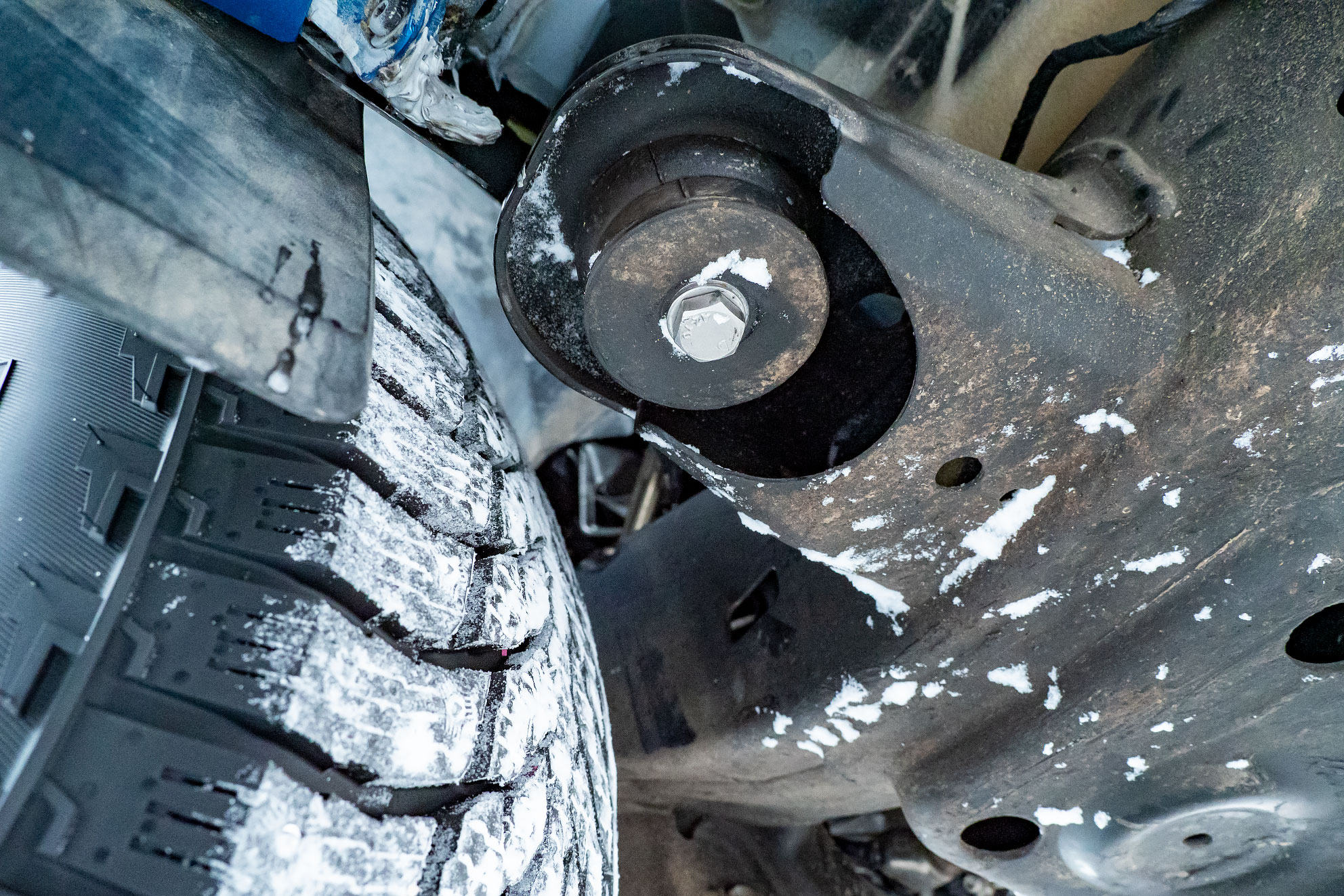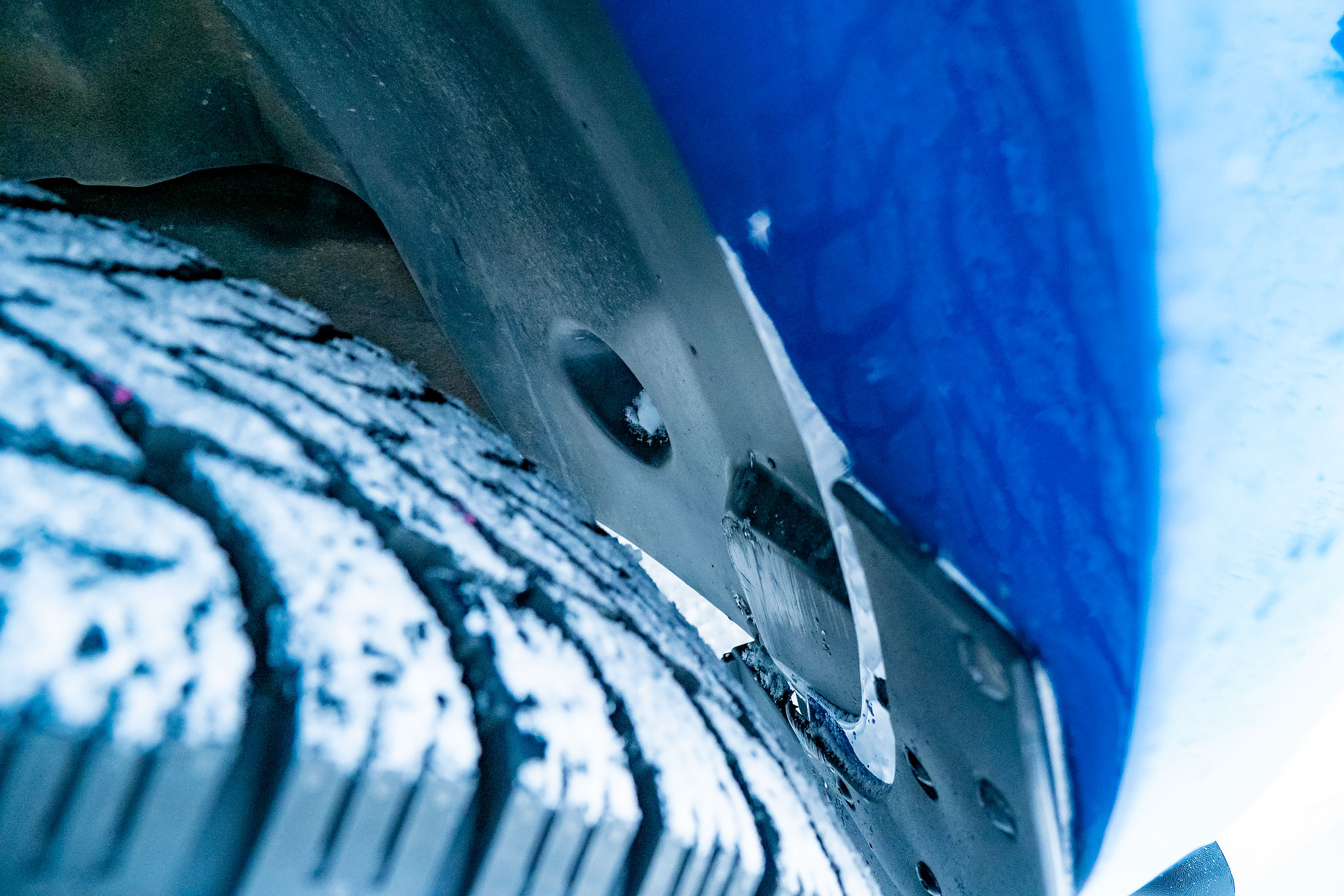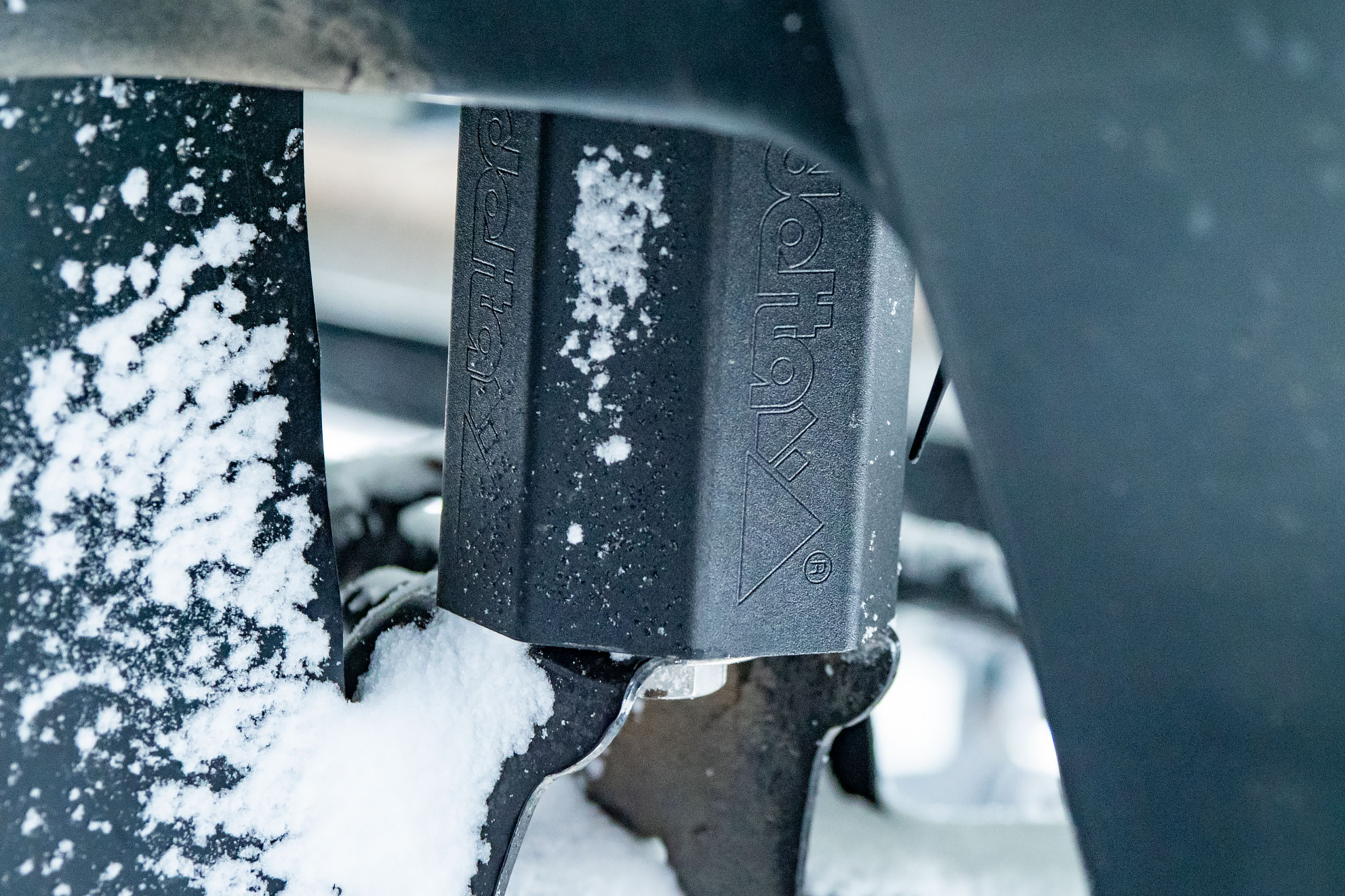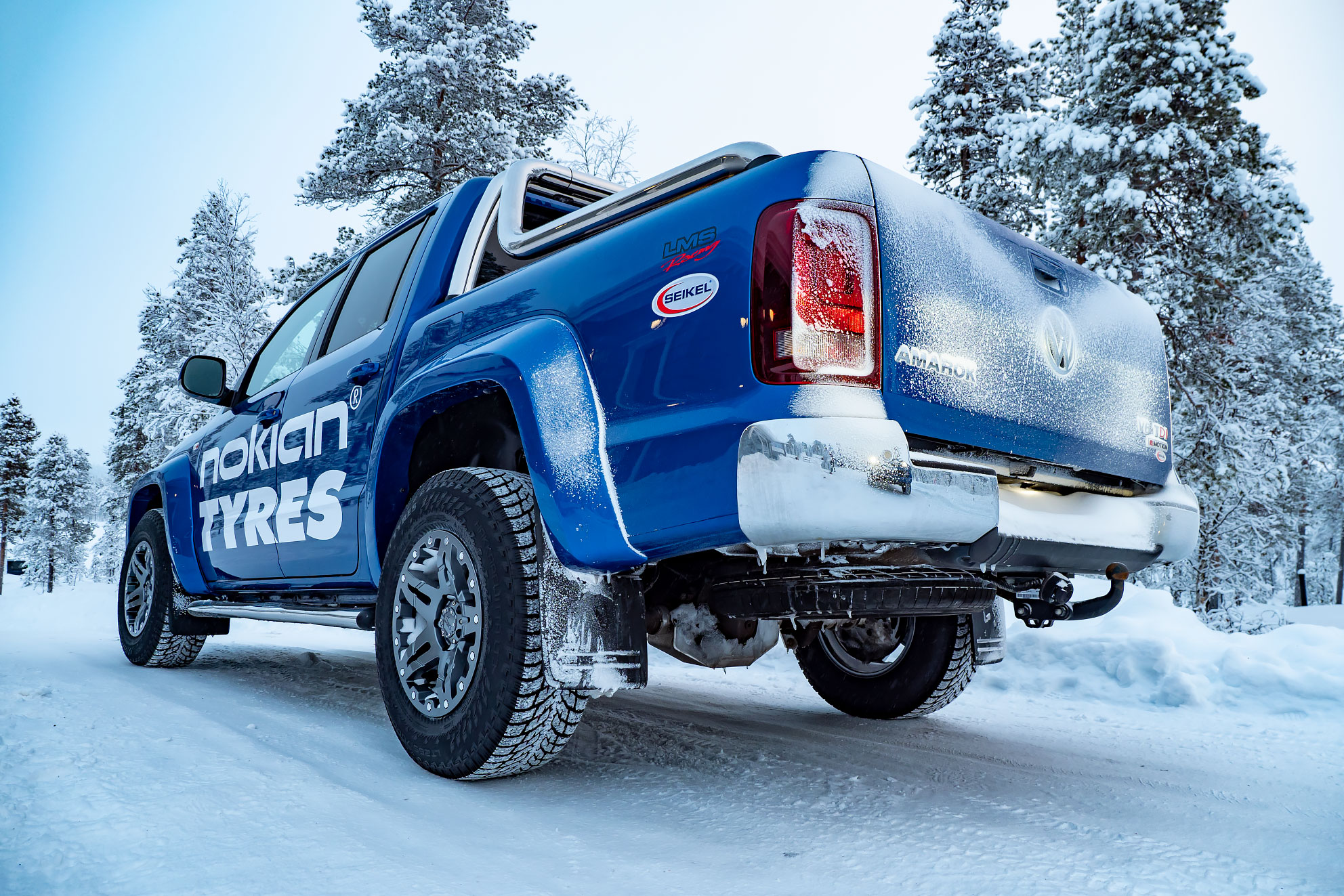 Отличить их можно по наличию лебедки под штатным бампером и ширине расширителей арок. Пикап без лебедки и с широкими расширителями стоит на 35-дюймовых шинах 315/70R17 (34,5 дюйма). Пикап с лебедкой под бампером и видимой алюминиевой защитой имеет 32-дюймовые колеса. Оба обуты в новые Nokian Hakkapeliitta LT3, ради которых мы приехали в Финляндию, на полигон White Hell.