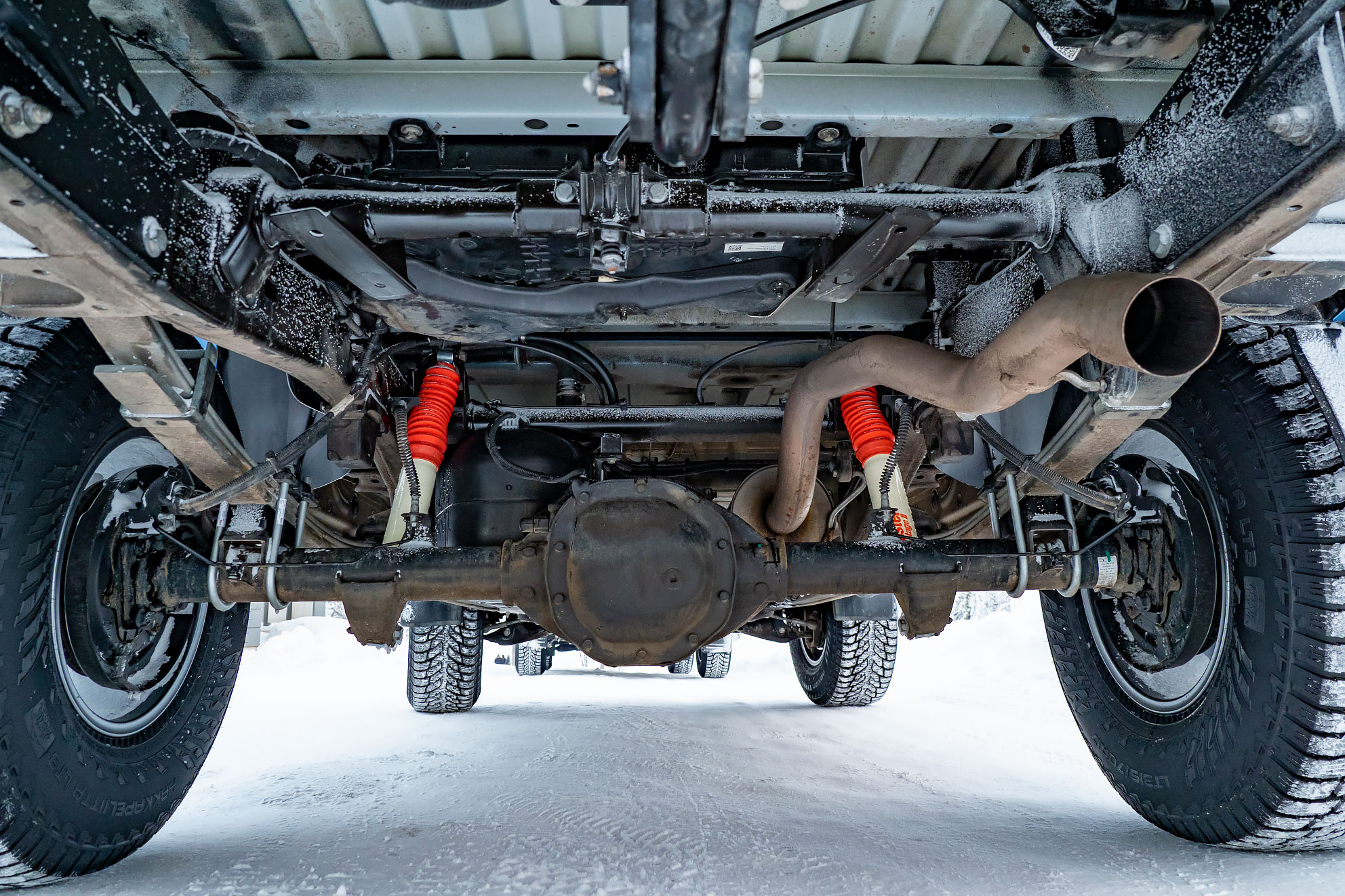 Наконец, передняя подвеска тоже приподнята на 25мм с помощью тюненых стоек от Delta 4×4. Интересно, что в ателье не посчитали нужным прикрыть щель в моторный отсек. Видимо в Заполярье не бывает грязи и это не представляет опасности.