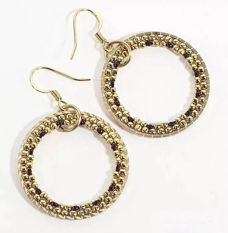 Для изготовления этих серег вы можете применить кирпичный стежок для создания рядов бисера на внутренней стороне уже готовых металлических или деревянных обручей. Из оформленных кругов получаются изящные серьги и подвески.