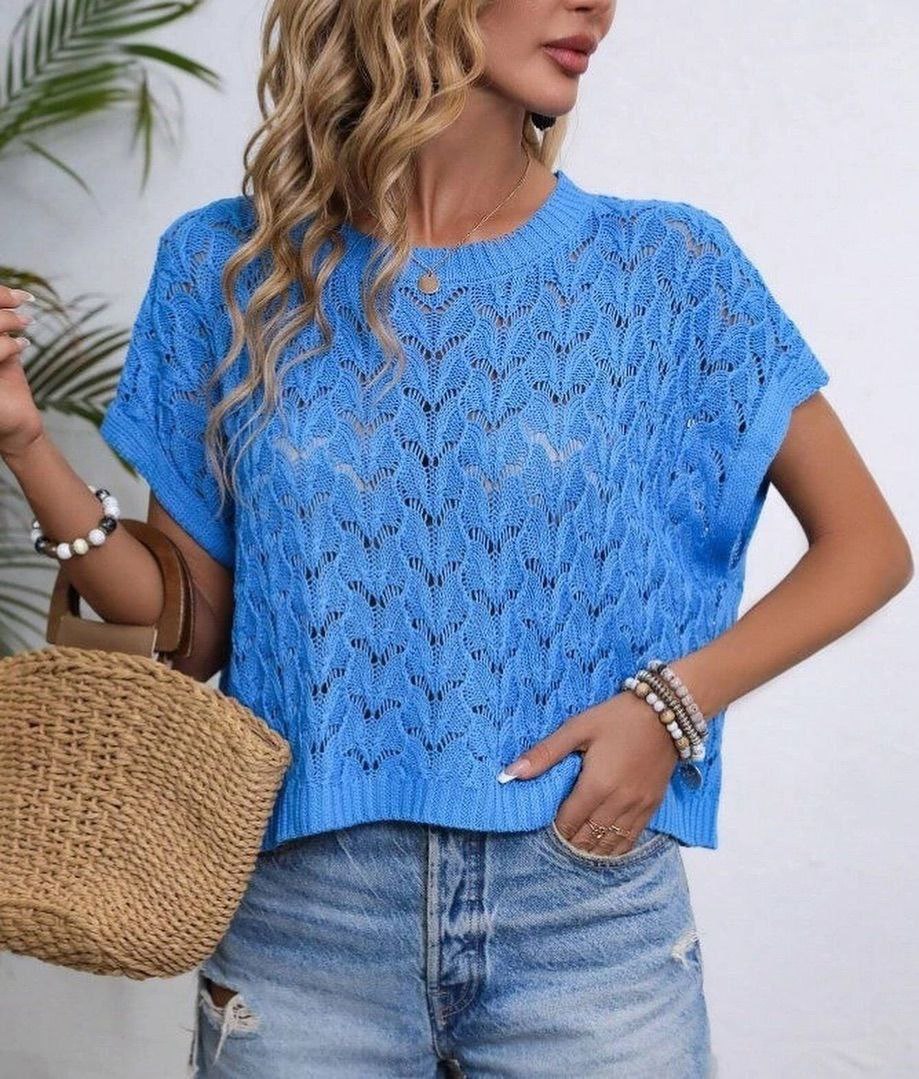 Элегантный вязаный топ насыщенного голубого оттенка с уникальным ажурным дизайном и свободным силуэтом. Отлично гармонирует с джинсами и аксессуарами из натуральных материалов, формируя легкий и невесомый образ.