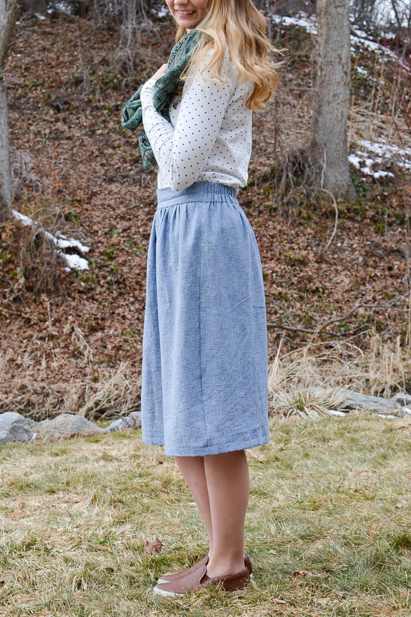 Теперь вы знаете, как сшить юбку на притачном поясе с резинкой сзади. Учитесь новому и будьте счастливы!