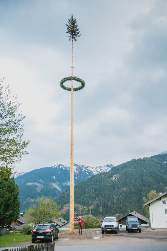 Майское дерево — длинный ствол дерева (например, часто встречается ель или березка, очищенные от веток почти до макушки), украшенный специальной "короной" и установленный где-нибудь в центральной части городка в честь праздника первого мая.