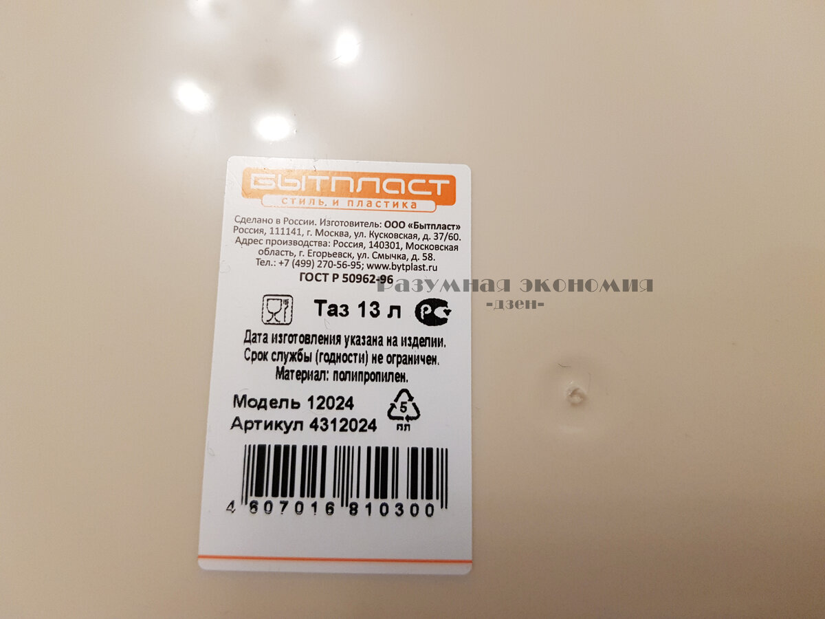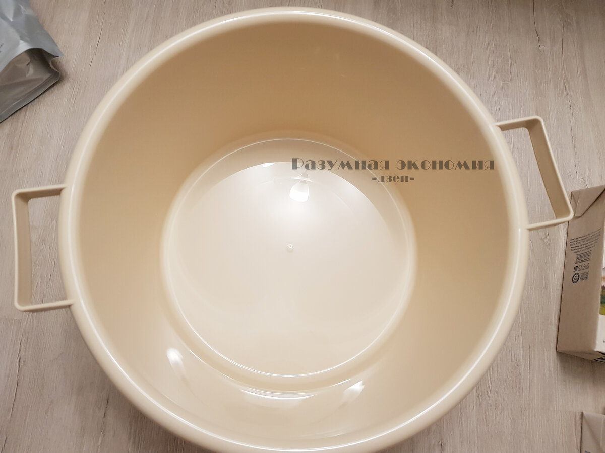 Таз с ручками. У нас был всего один, но он сломался ещё осенью, и приходилось стирать вручную в раковине. Теперь я знаю, что современные тазы нельзя использовать в качестве подставки, чтобы достать что-то с верхней полки. Выбрала оптимальный по размеру и цвету (ванная бежевая) — 300 рублей.