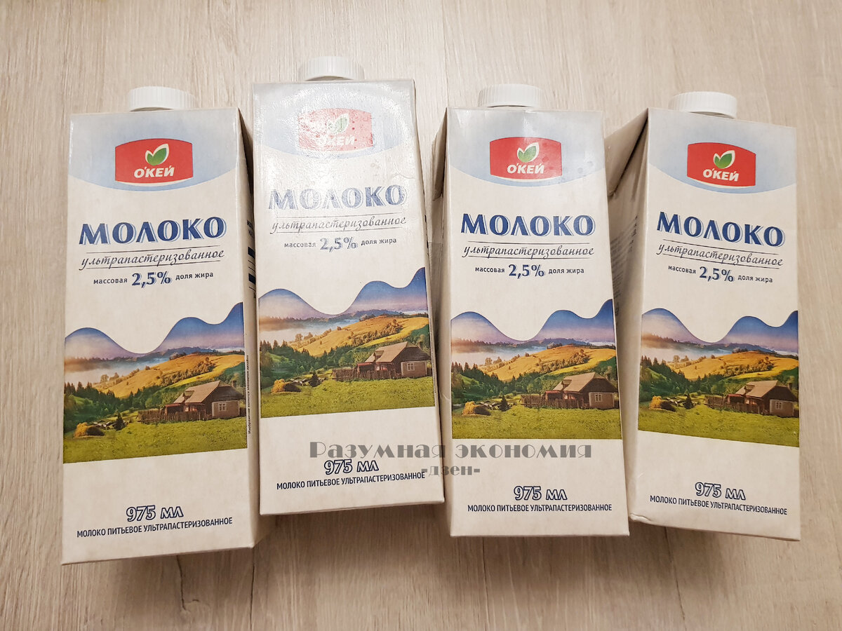 Молоко ультрапастеризованное 2,5% собственной торговой марки. Нормальное молоко на каши для завтраков. Всегда берём несколько коробок, когда выгодная цена. 68 рублей за упаковку.