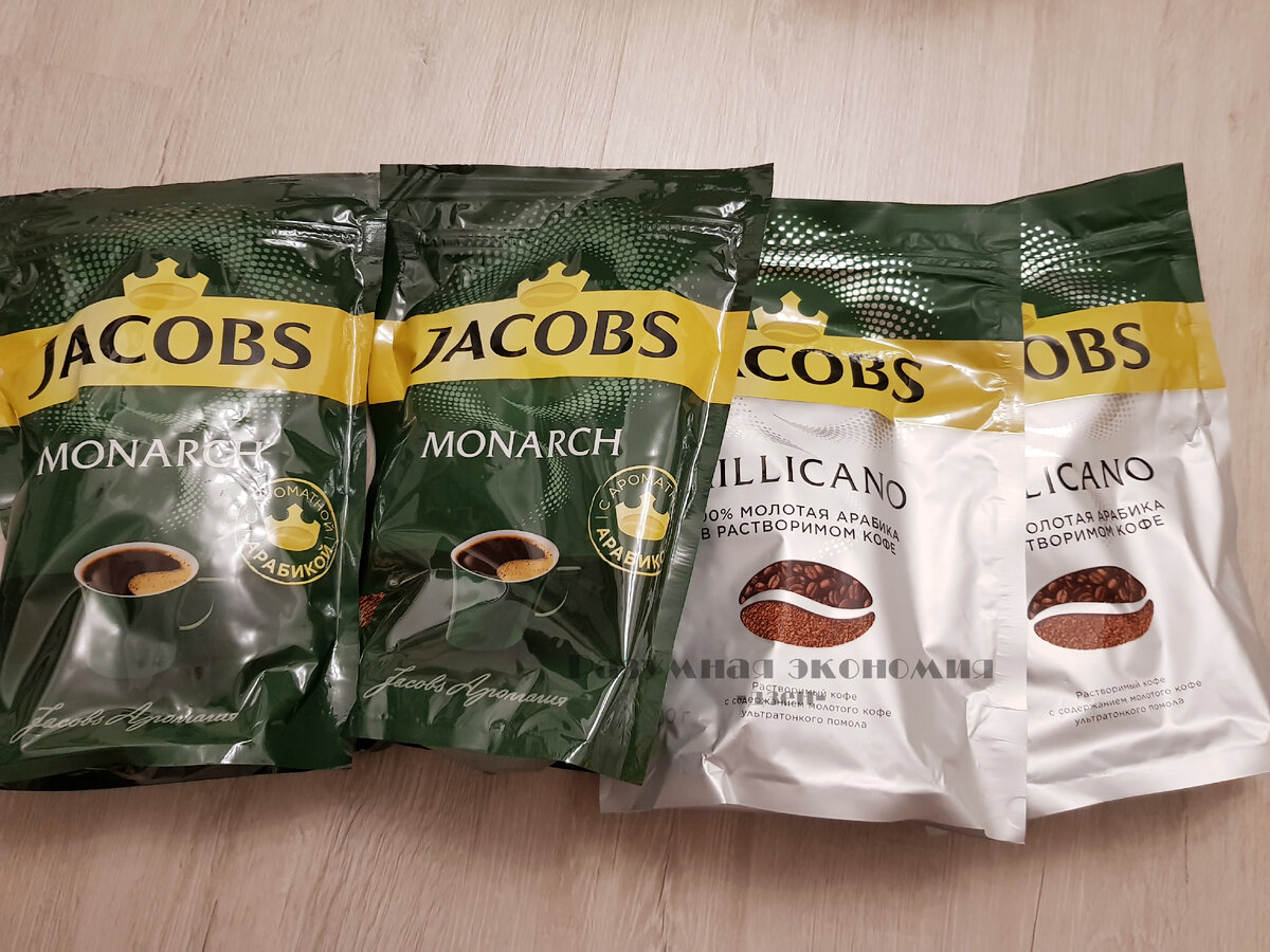 Сублимированный кофе Jacobs на презенты к будущим праздникам. Родственники мужа любят Монарх, мои — Милликано. Каждая пачка стоила 400 рублей, но у "Монарха" масса грамм на 20 больше (200 и 220 грамм).