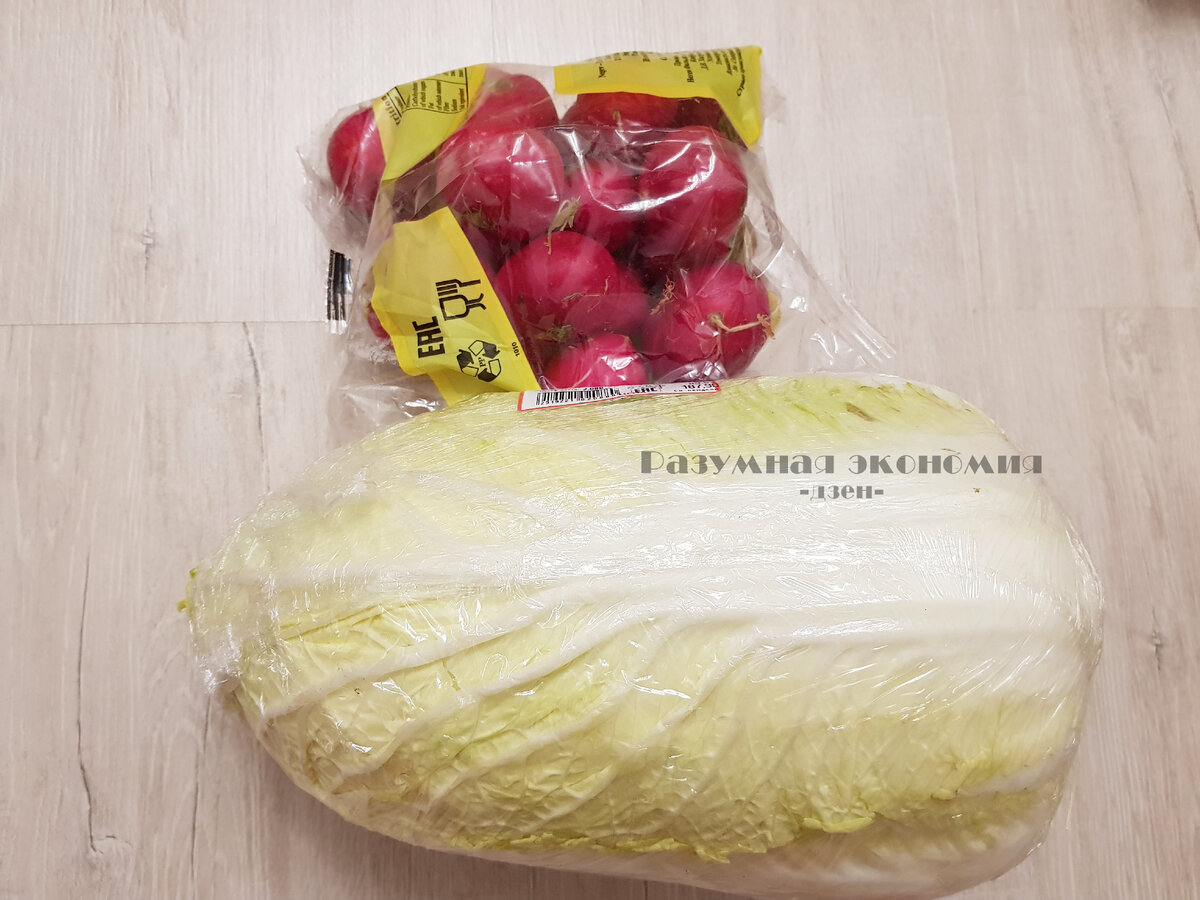 Свежее всё дома было, взяли только китайскую капусту (90 рублей за кило) и очень дорогой редис (190 рублей за 500 грамм).