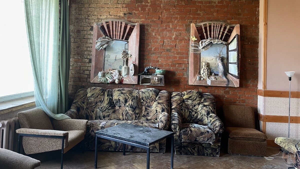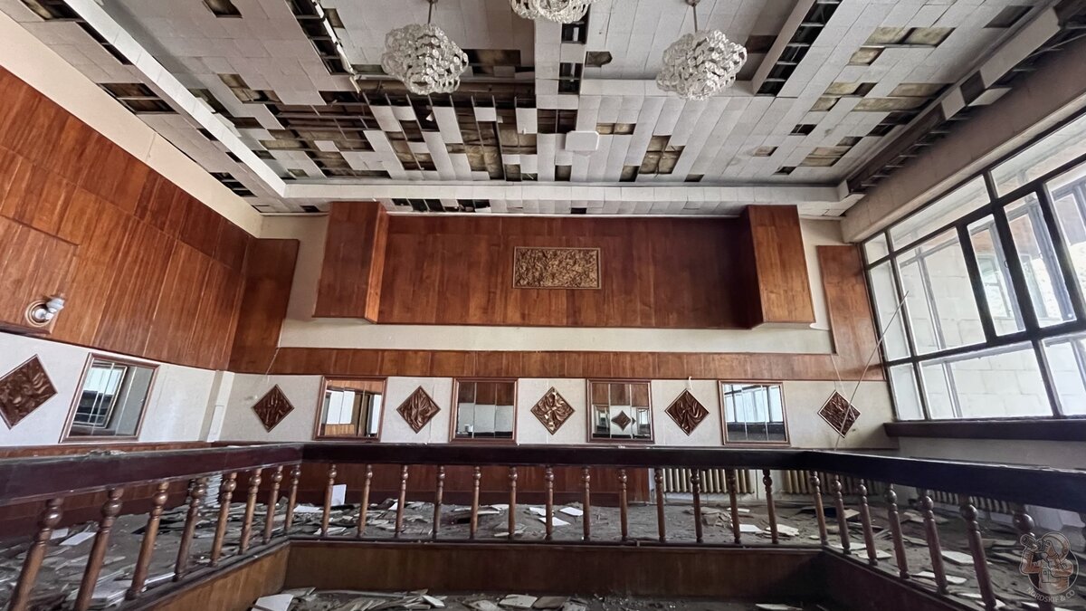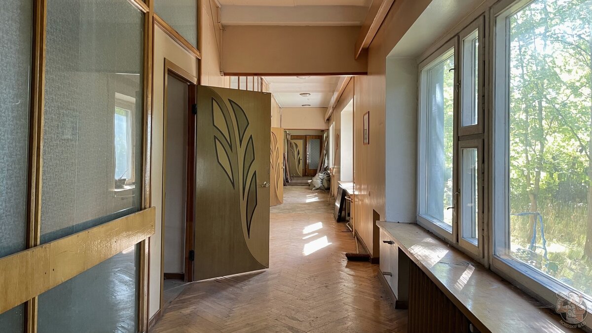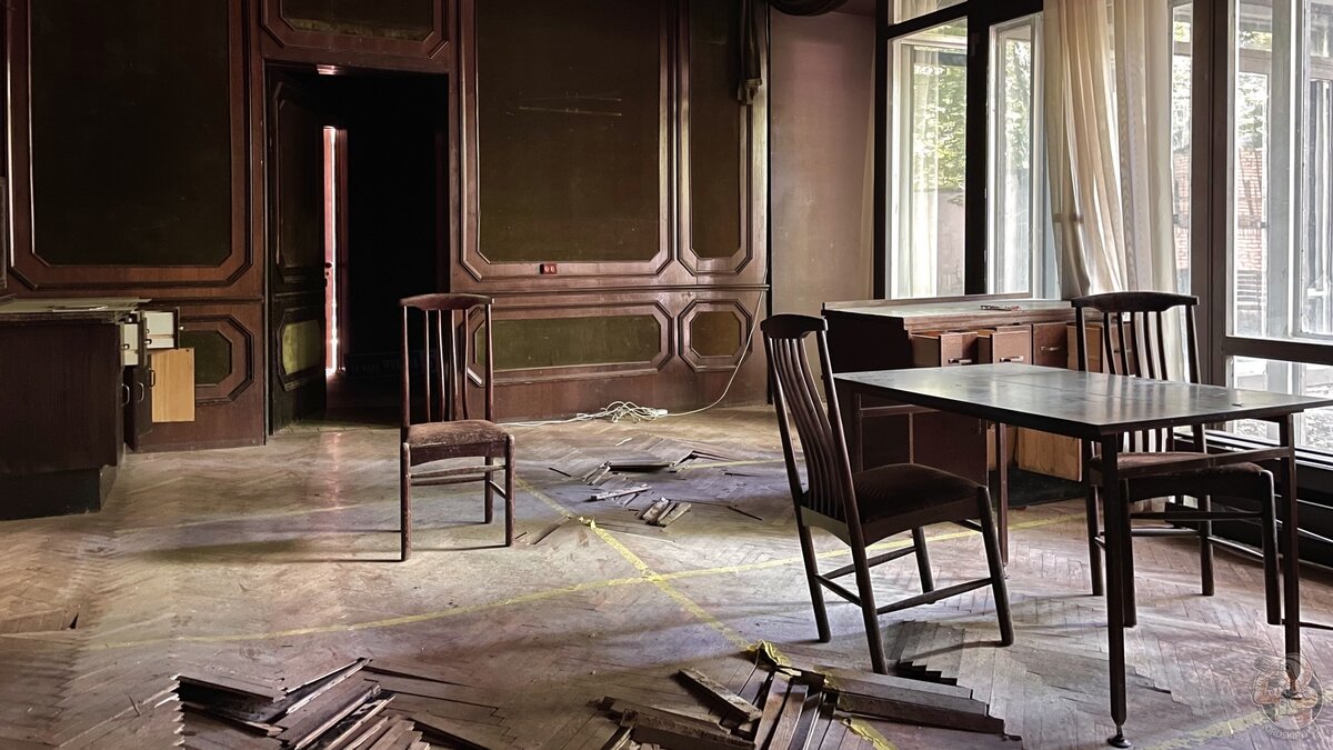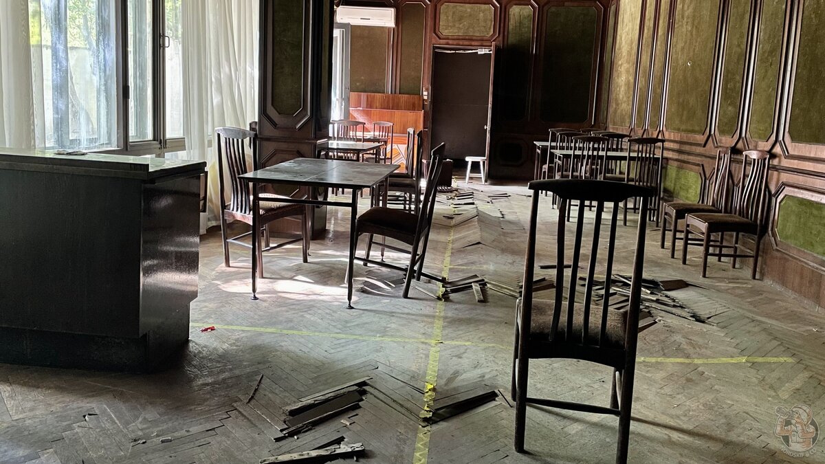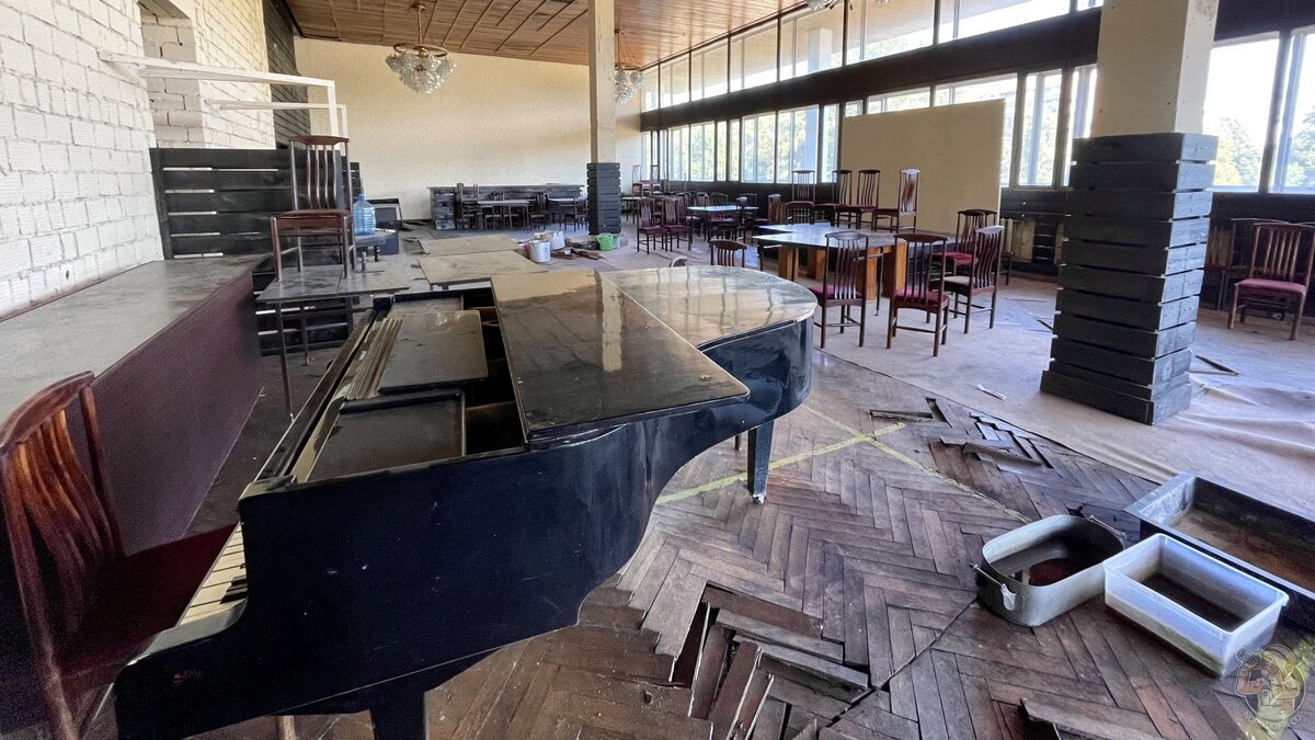 Первое, что мы видим — это тёмный каминный зал с сохранившимися столами и стульями, но уже разваливающимся паркетом. Ощущение, будто мы оказались в старинном особняке, но на деле это обычный пансионат. Правда, довольно крупный для маленького подмосковного городка.