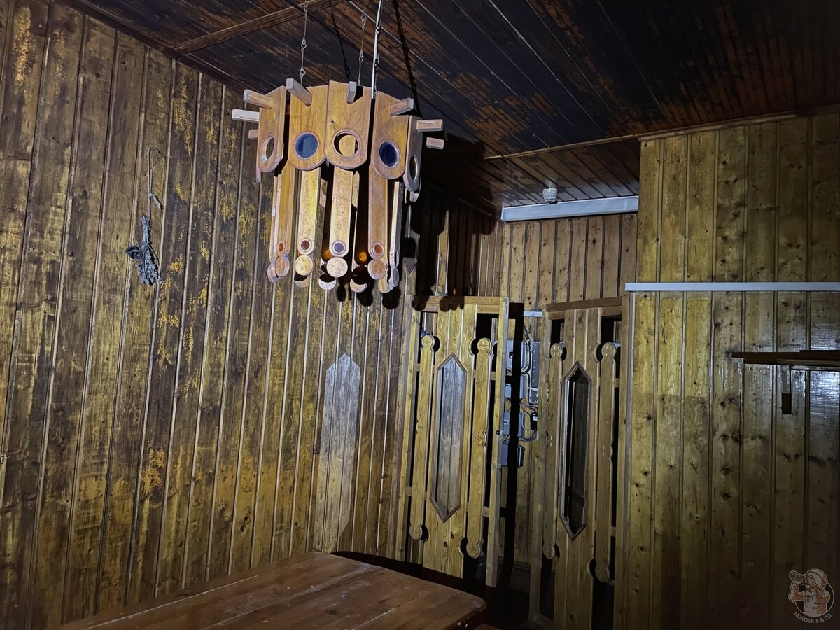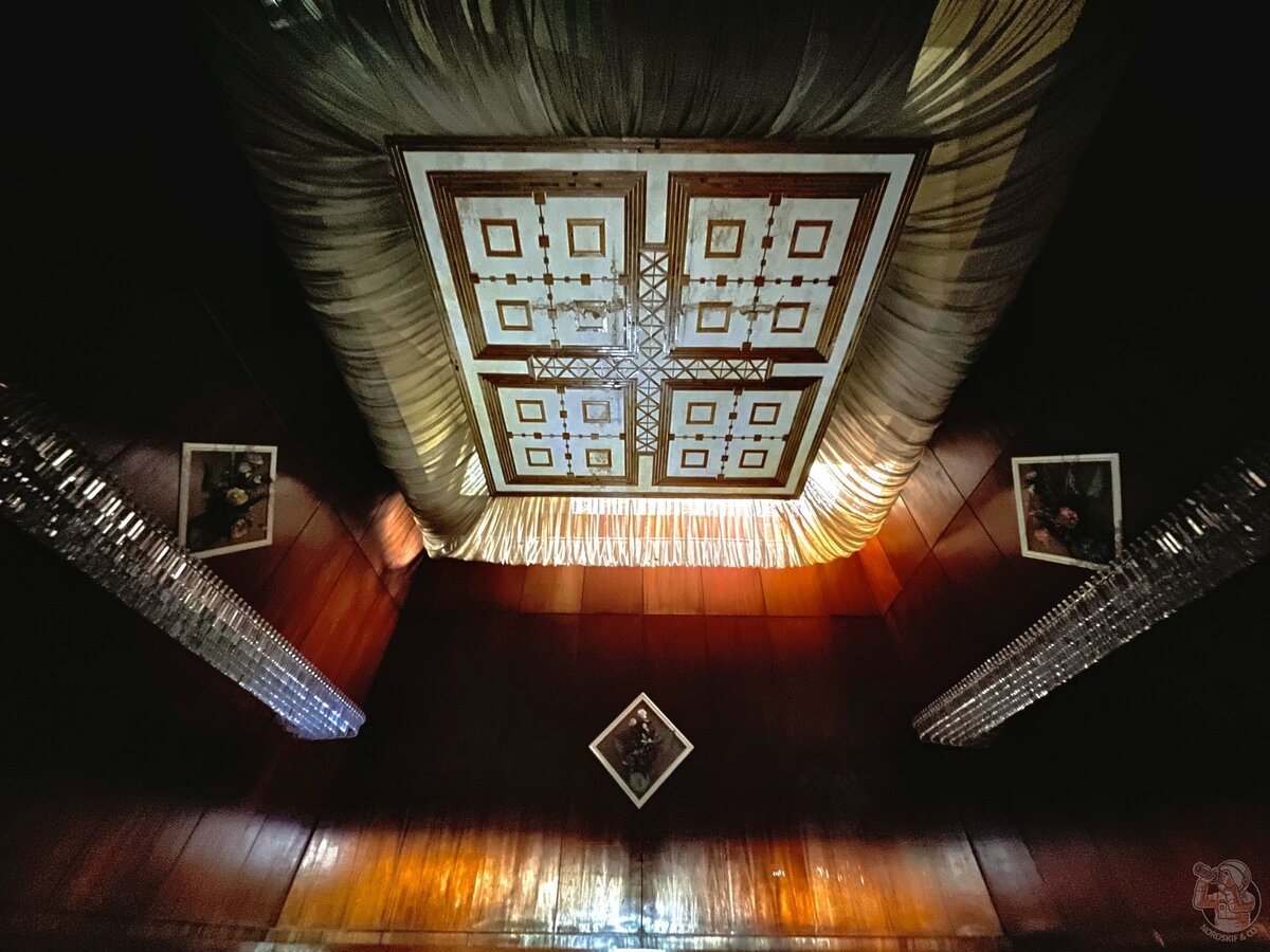 Идём дальше и попадаем в большой холл, где, по всей видимости, проходили крупные торжества с живой музыкой, которую исполняли на ещё сохранившемся рояле. Поражает и соседняя комната с необычным убранством, погрязшая в темноту из-за отсутствия электричества.