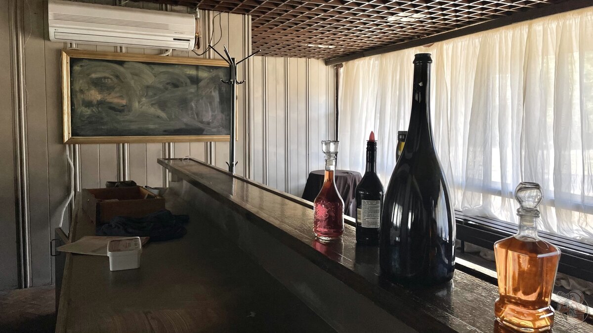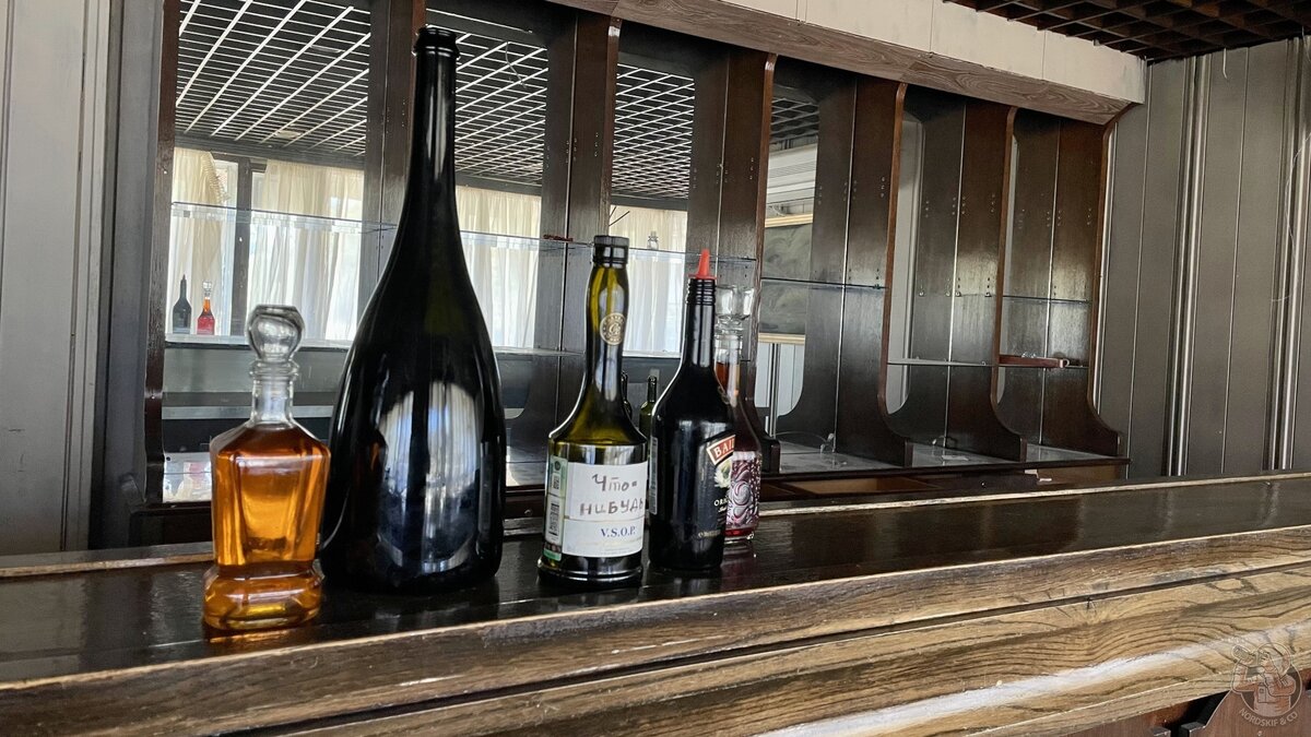 Помимо крупного торжественного зала, постояльцы пансионата могли весело проводить время в баре, за стойкой которого остались стоять пустые бутылки и бокалы. Некоторые из них явно принесли уже посетители вроде нас для антуража.