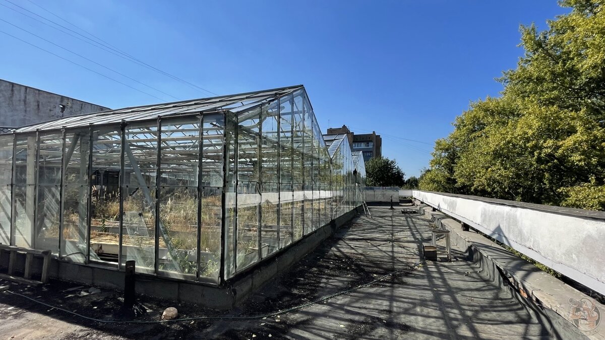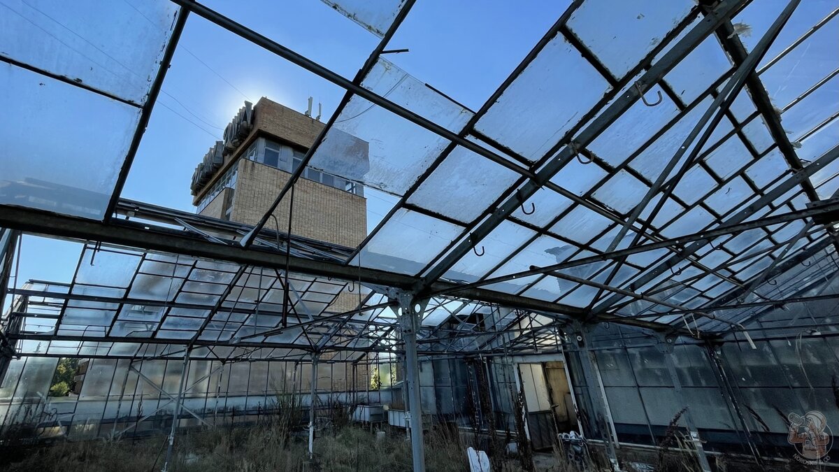 Напоследок поднимемся на крышу пансионата. И здесь тоже оказалось, что посмотреть — на самом верху были теплицы, только части стёкол уже не хватало и всё заросло.