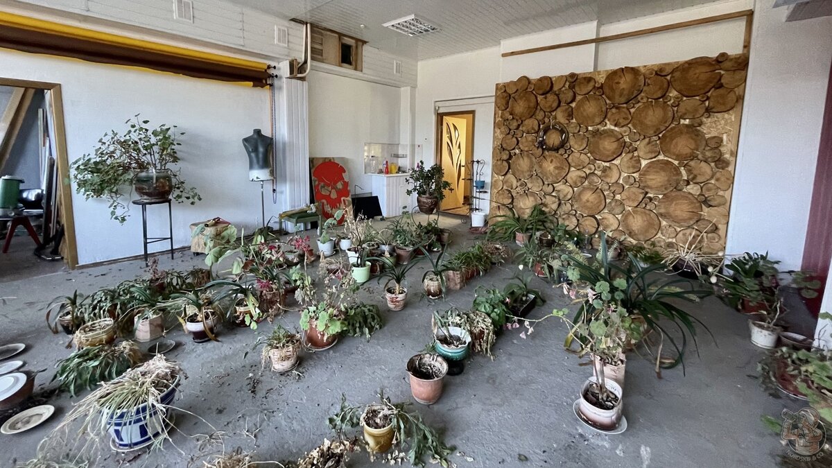 Посмотрим, что тут было ещё. К сожалению, на заброшенных местах очень часто остаются растения, которые никто не забирает и попросту оставляет засыхать. Эту картину мы встретили и здесь. На полу в углу стоял небольшой кувшин с водой — возможно, кто-то недавно поливал несчастные цветы, но все равно их состояние удручало.