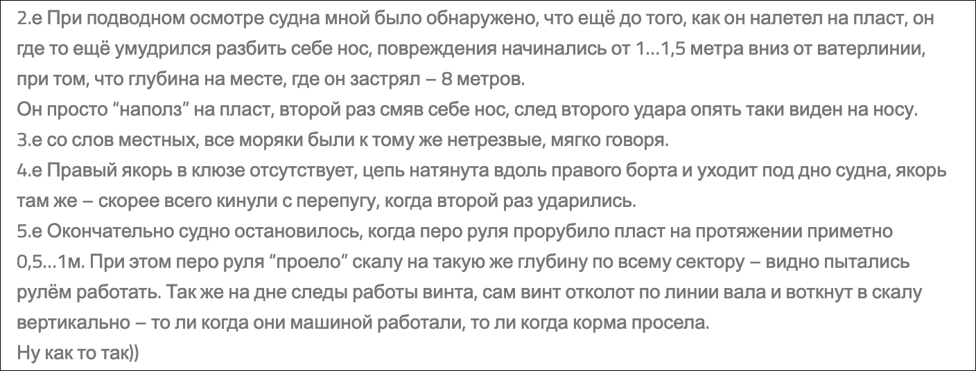 Кроме того, вы сети можно найти рассказы местных жителей, который на совершенно другой версии: судно шло СВОИМ ходом (не на якоре) прямиком на берег, ему «вояки» с маяка сигналили ракетами об опасности, пытались предупредить по радио, но команда не отреагировала.