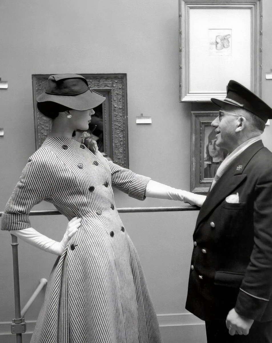Здесь модель почти касается рамы абстрактной картины. Платье с асимметричной линией пуговиц, шляпа, легкий наклон головы. Геометрия фона и платье ведут неспешный диалог, а женщина вообще не спешит никуда. Кажется, что она сейчас поправит поля шляпы и спросит, кто придумал эту математическую стену за ее спиной. Никаких бурь, лишь спокойное, дозированное кокетство.