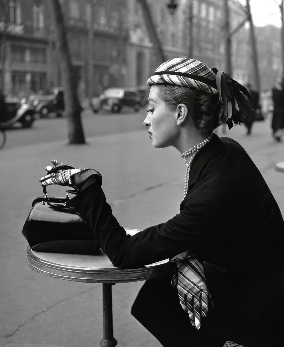 Вот пример. Модель сидит на парапете, рядом рыбаки вытаскивают свои снасти из Сены, на заднем плане — мост и невозмутимый Париж. Юбка аккуратно разложена, шляпка, жемчужное ожерелье, но в позе читается чистое любопытство: что там поймали, не зацепился ли кто за подол моды удочкой. Кадр работает как маленький фильм, где героиня на минуту отвлеклась от фотосессии и полностью забыла про рекламную задачу.